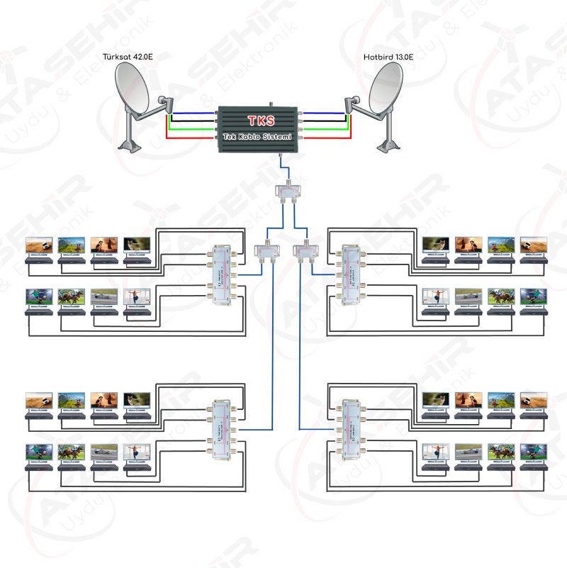 Örnek 1. çanak anten TÜRKSAT 42.0E, 2. çanak anten HOTBİRD 13.0E, 3.çanak anten ASTRA 19.0E, 4.çanak anten EUTELSAT W3 7E (Digiturk) uydularına ayarlanarak ve bu çanak antenlerden 17 serili bir Multiswtich’e bağlantı yapılarak daire sakinleri binlerce şifreli, şifresiz kanal izleyebilir.